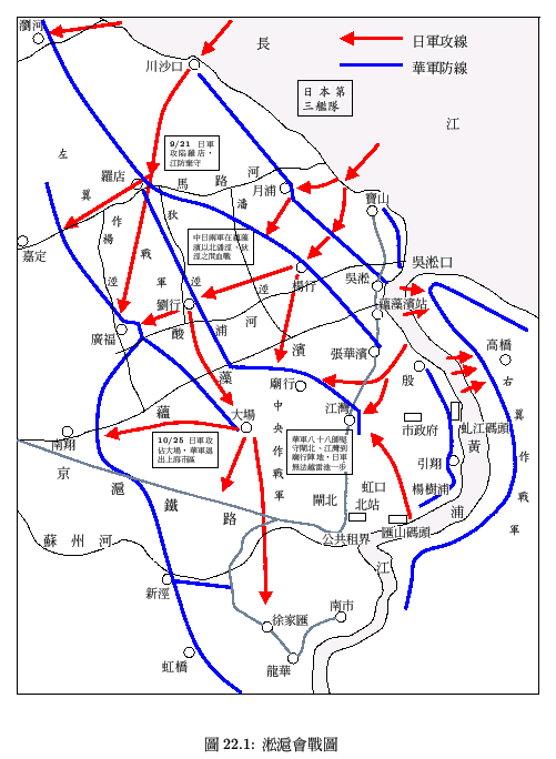 松井石根得到增援之后,还是将主力放在上海西北部的郊区,以进行对华军的 侧翼包围作战,不过此时日军深入内陆,已经没有威力强大的海军舰炮的火力支 援了。日军从九月十一日到十月二十日的四十天之内,在这个地区的作战进展是 ,从潘泾打到杨泾而已,东西的距离是五公里,多处阵地的争夺,可以说是几度 相互易手,华军的每个据点大都是拚到弹尽援绝,血肉成河,才不能不退。松井 石根用尽各种作战的王牌,最后才终於在十月七日,突破蕴藻滨河道的华军防线 ,攻到上海西方郊区的交通枢纽大场。日军只要攻陷大场,华军在上海市区以及 浦东的部队,也只有退出阵地,以免受到日军的包围。