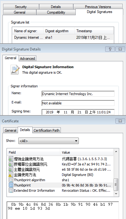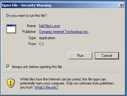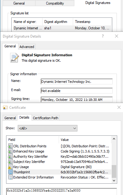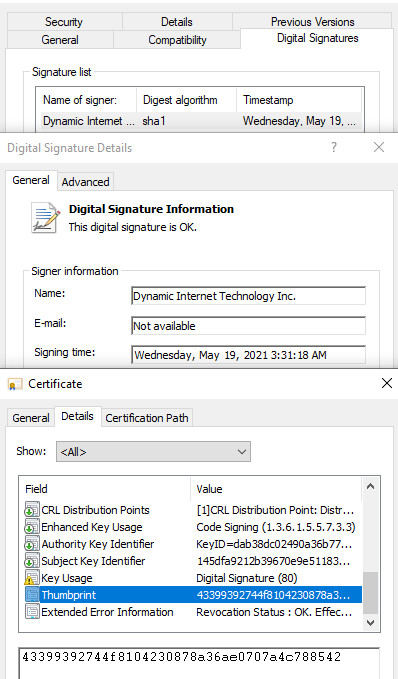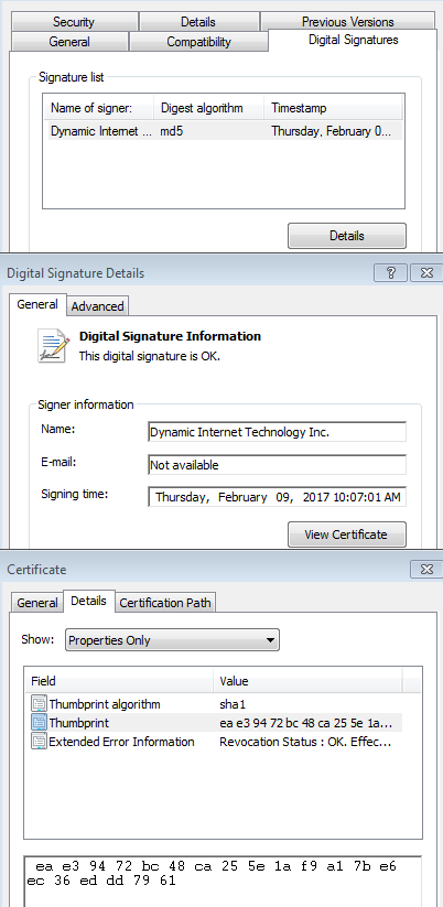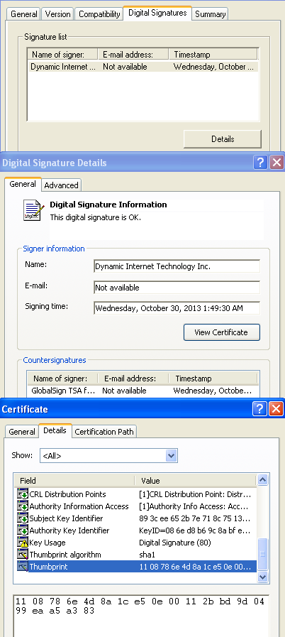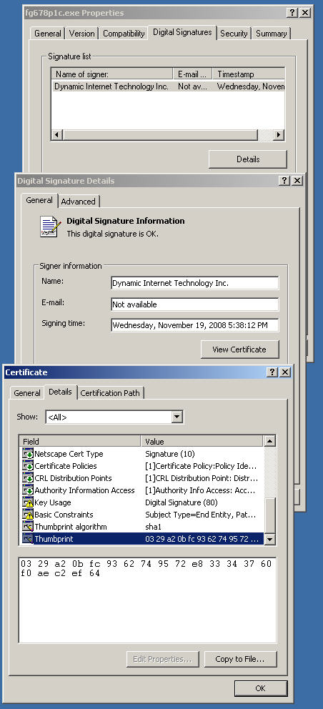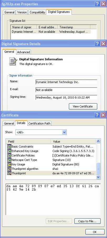 Integrity Check If you use Freegate in a hostile environment such as in a closed society, especially if your Freegate software is not directly downloaded from the Dynaweb official website (http://dongtaiwang.com/home_en.php), you should check its integrity before using it. You can never be too careful -- the bad guys from repressive regimes have been known to implant viruses or Trojans in software to trap unsuspecting users. Never trust a file sent to you as a Freegate patch without checking its integrity. How to do integrity check We use digital signatures for the EXE and DLL files of Freegate to safeguard their integrity. To check the digital signature of a file, right click on its icon, select Properties from the popup menu, and select the Digital Signatures tab. You should see a signature by "Dynamic Internet Technology, Inc" Highlight the signature, click the Details button, and you should see "This digital signature is OK." See the following screenshot for an example: Warning: If you do not see the Digital Signatures tab, or if the signature is not by "Dynamic Internet Technology, Inc" or if the signature is invalid, you should not use the file. Dynaweb software released after Oct. 10, 2022 carry the following digital signature. Dynaweb software released after May 19, 2021 carry the following digital signature. Dynaweb software released after September 24 2019 carry the following digital signature. Dynaweb software released after July 15 2016 carry the following digital signature. Dynaweb software released after November 1 2013 carry the following digital signature. Dynaweb software released between August 1 2010 and November 1 2013 carry the following digital signature. Dynaweb software released before August 1 2010 carry the following digital signature. If you have downloaded software with Internet Explorer, the following window will popup when you start it. This window also displays the correct signing company "Dynamic Internet Technology, Inc". |